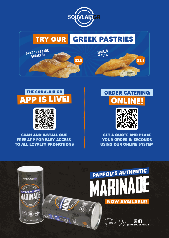 Your choice of 4 Souvlakia, 4 serves of Chips and 4 x Drinks!